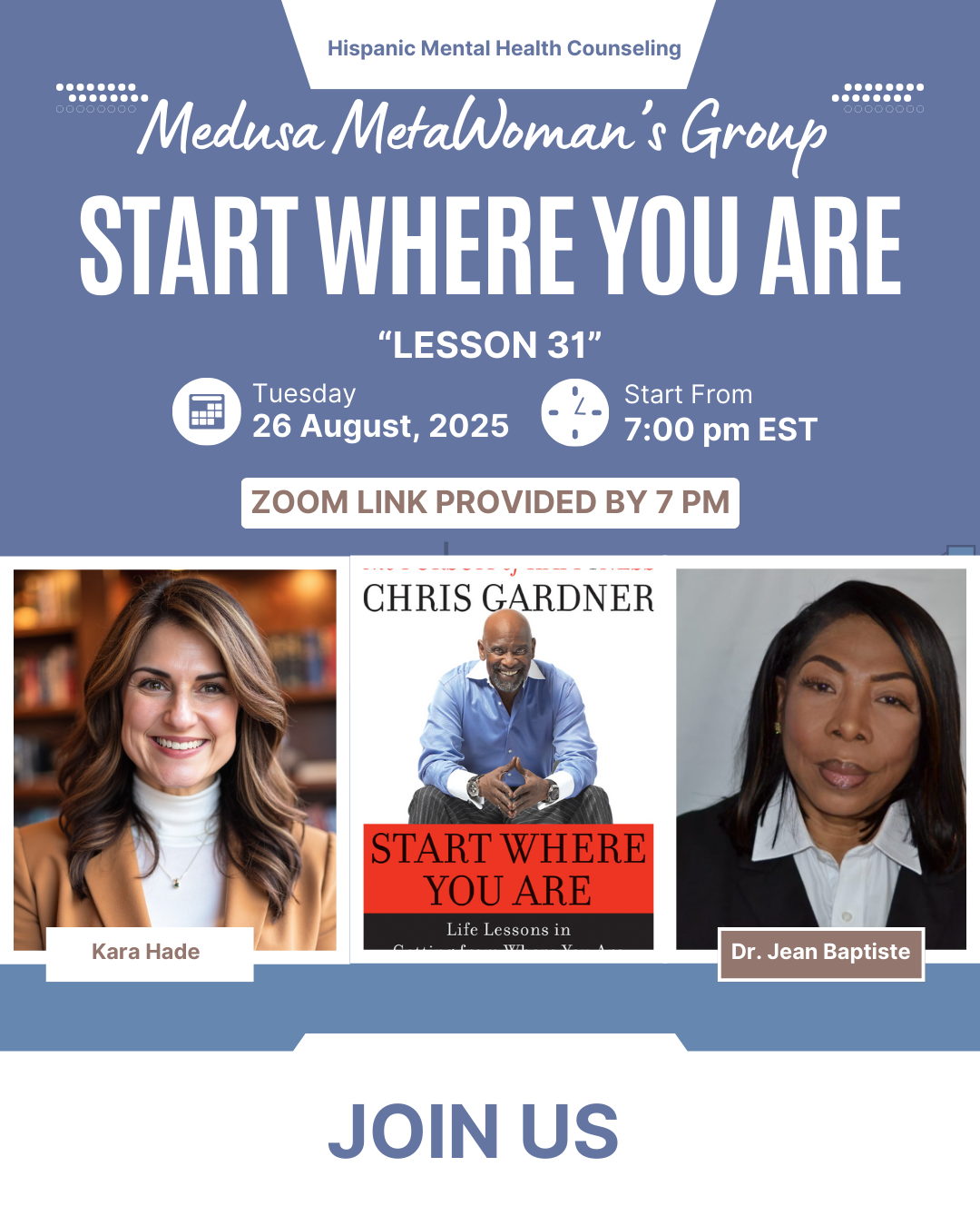 We began 2025 with a new book for the group, “Start Where You Are,” by Chris Gardner.” Beginning this Tuesday at 7:30 pm, we continue our discussion of one of the 44 LIFE LESSONS that Chris Gardner presents in his book and share how we can incorporate it into our lives.